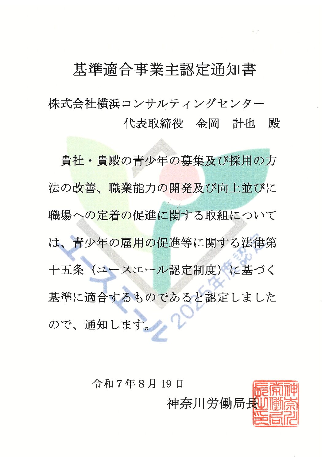 このたび当社は、厚生労働省より「ユースエール認定企業」として認定されました。